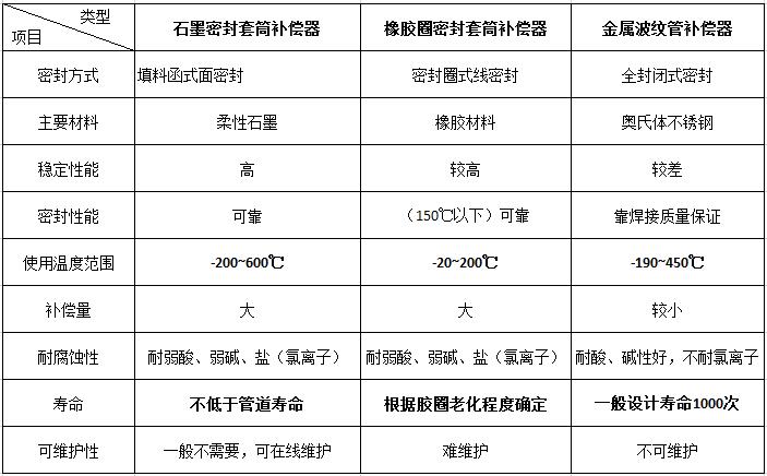 2、膠圈密封套筒補償器內(nèi)、外套剛度大、強度高(強度高于管道),溫度不宜超過2000℃,在一定溫度時間內(nèi)密封較可靠。膠圈的特性及線密封方式,對安裝的直線度要求更高,管道沉降易發(fā)生泄露。一定時間橡膠老化或膠圈磨損,補償器泄露,只能停止運行更換補償器。