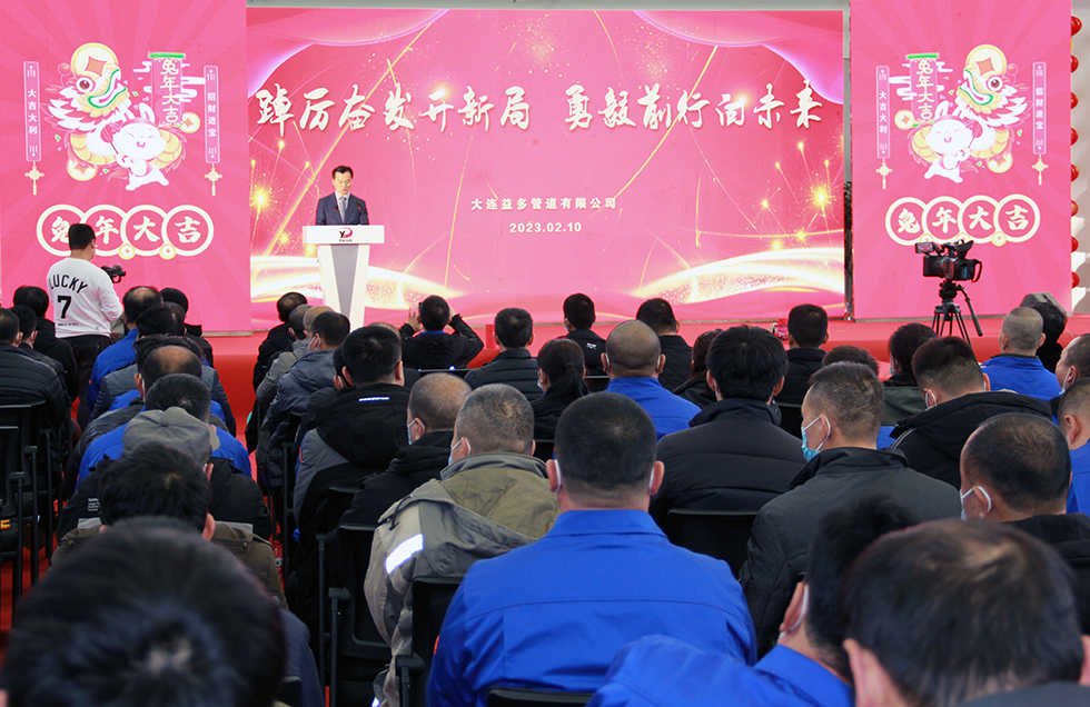 豪情歡歌辭舊歲,喜氣開篇迎新年。2023年2月10日,大連益多管道有限公司2023年年會在公司體育館隆重召開。會議隆重表彰了2022年作出突出貢獻的集體和個人。19名員工獲得先進個人,33名員工獲得特殊貢獻獎,6個部門獲得先進集體??偨?jīng)理郭德軍作了題為“踔厲奮發(fā)開新局 勇毅前行向未來”的報告,姜忠強、周秀麗、鄭欣東分別代表獲獎?wù)甙l(fā)言。會議由副總經(jīng)理劉忠科主持,全體員工參加會議。年會最后舉行了盛大的聯(lián)歡。